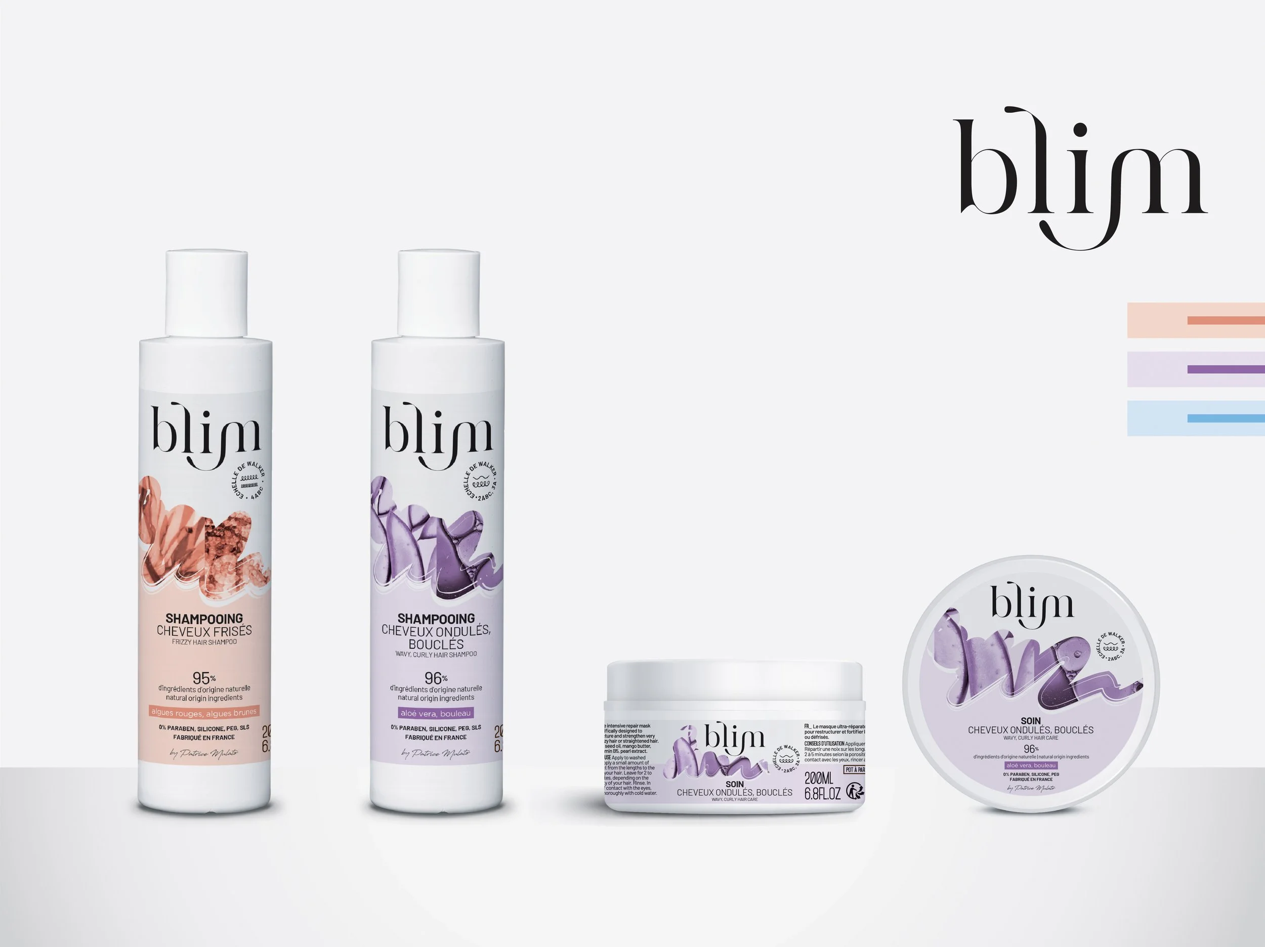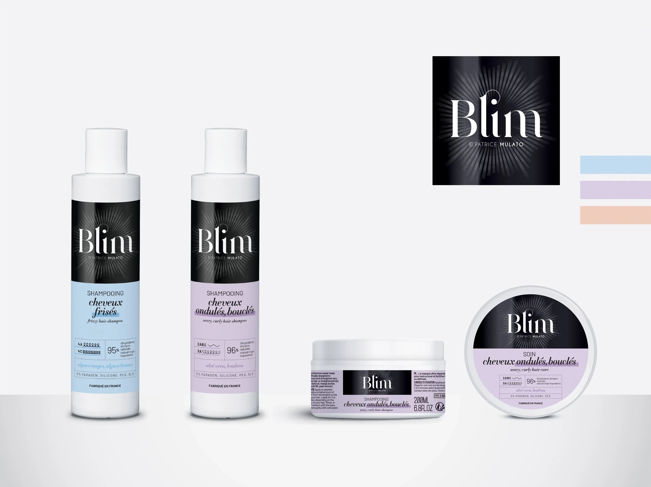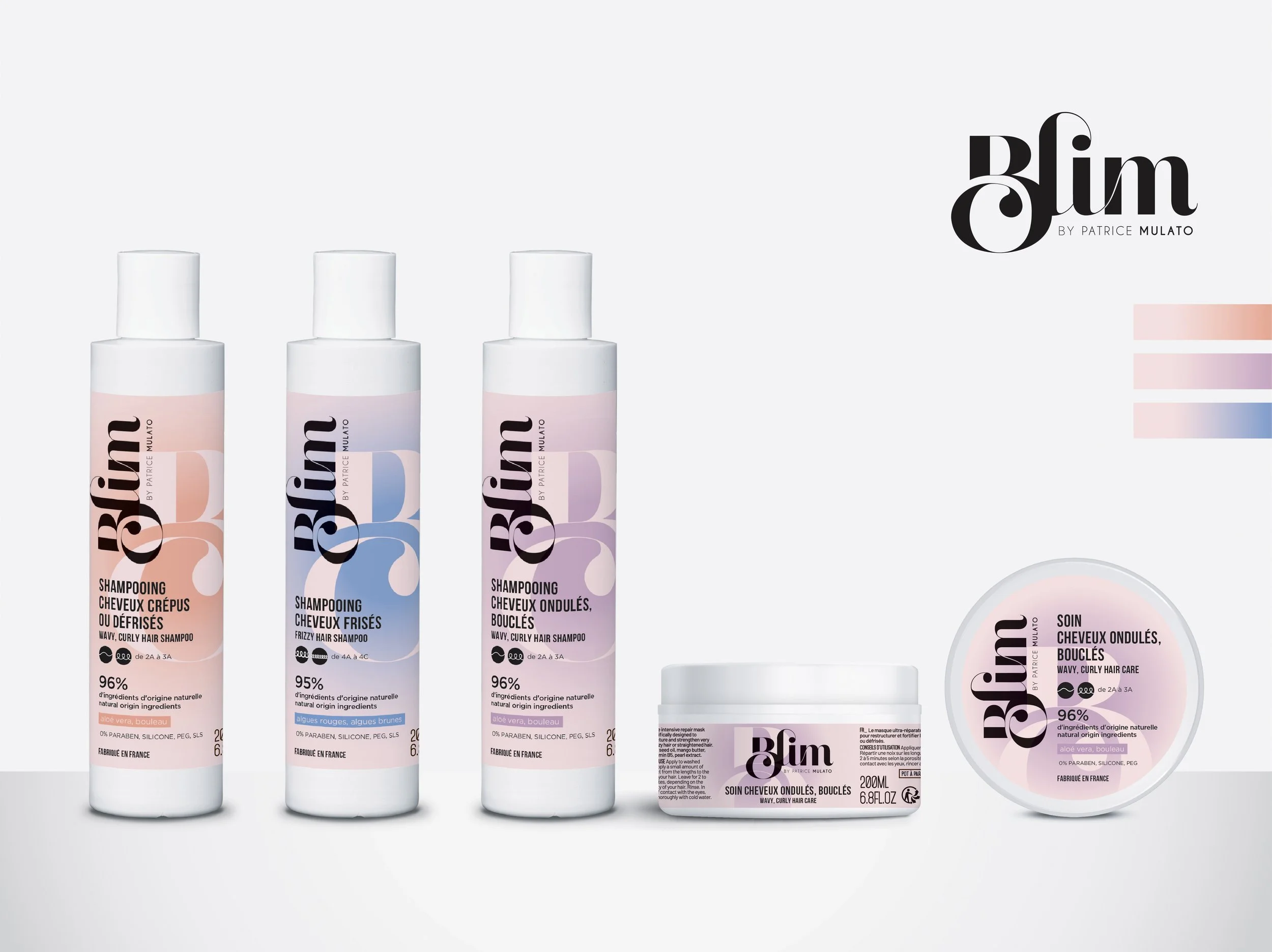 Après le choix d’un axe créatif (piste Aura), de nombreux aller-retours pour peaufiner la créa, un développement sur la totalité de la gamme (24 références, sur les 4 modules définis) et la réalisation de tous les gabarits imprimables de la gamme, je suis fière de vous partager le résultat de cette nouvelle gamme intitulée Blim, spécifique pour cheveux texturés, de la marque très renommée Patrice Mulato !